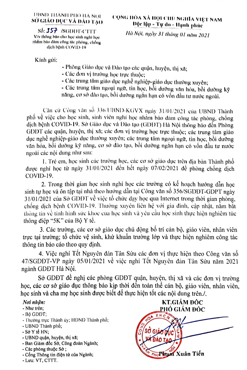 Công văn thông báo cho học sinh nghỉ học nhằm đảm bảo công tác phòng, chống dịch bệnh COVID-19