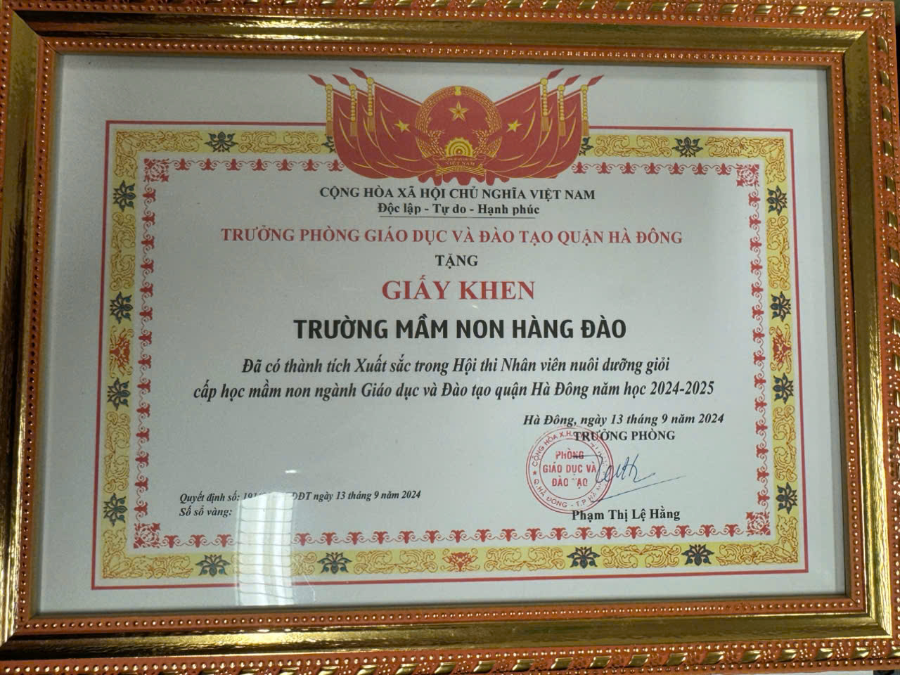 Trong “Hội thi Nhân viên nuôi dưỡng giỏi cấp học mầm non ngành Giáo dục và Đào tạo Quận Hà Đông năm học 2024 – 2025”, nhà trường vinh dự được nhận Giấy khen có thành tích Xuất sắc và 2 đồng chí nhân viên nuôi dưỡng đạt giải nhì.