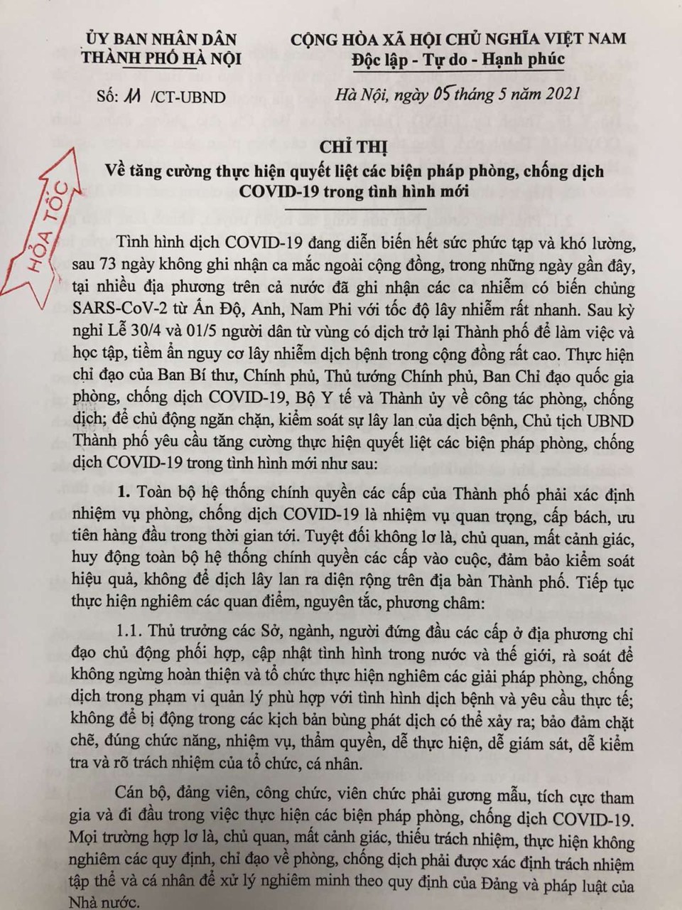Chỉ thị số 11-CT-UBND ngày 05/05/2021 về tăng cường thực hiện quyết liệt phòng chống dịch COVID-19 trong tình hình mới