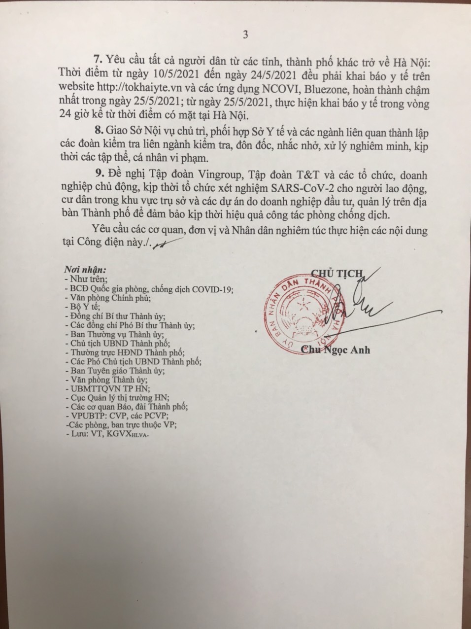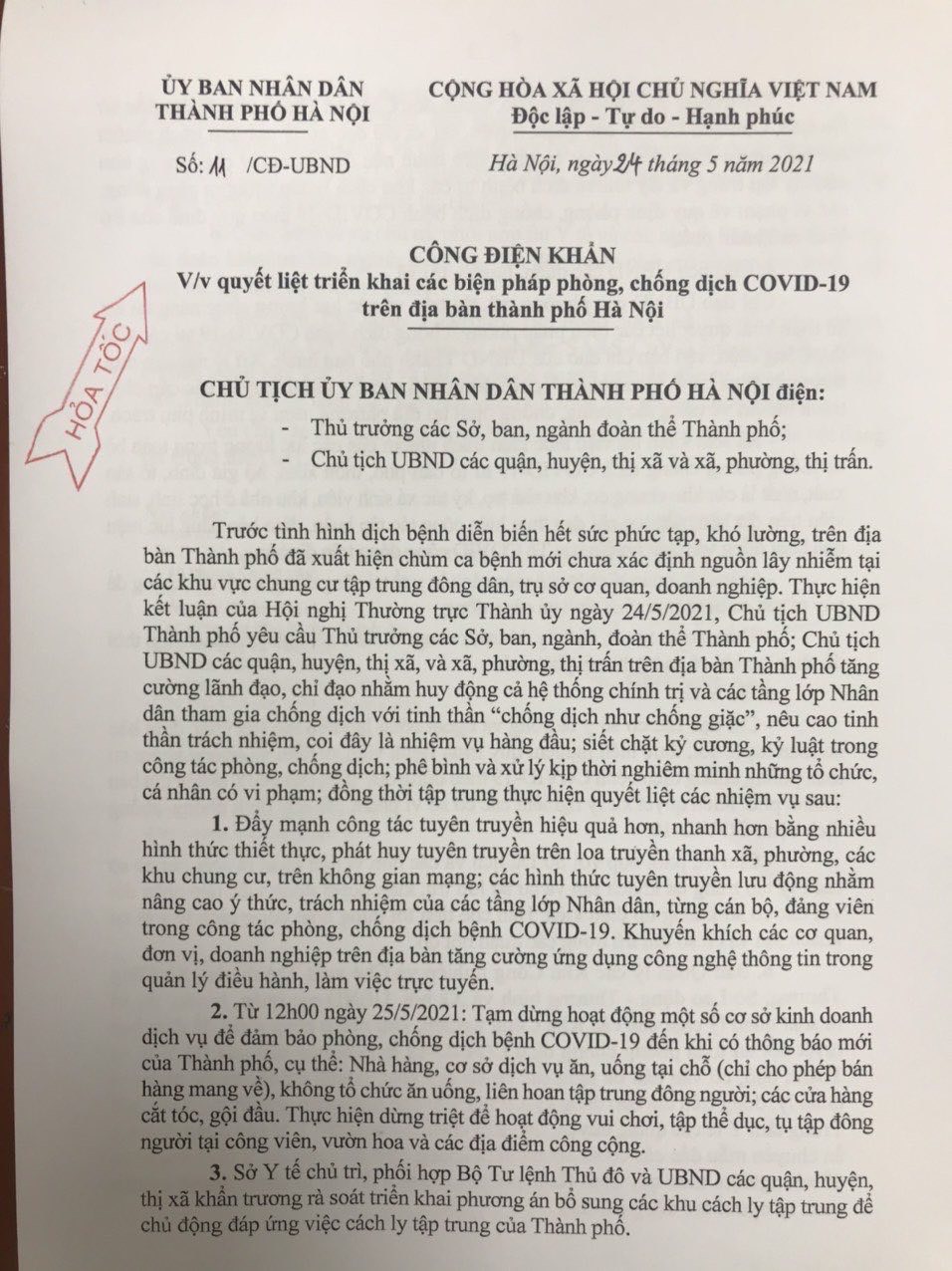 Công điện khẩn số 11/CĐ-UBND ngày 24/05/2021 của UBND Thành phố Hà Nội về việc quyết liệt triển khai các biện pháp phòng, chống dịch COVID-19 trên địa bàn thành phố Hà Nội