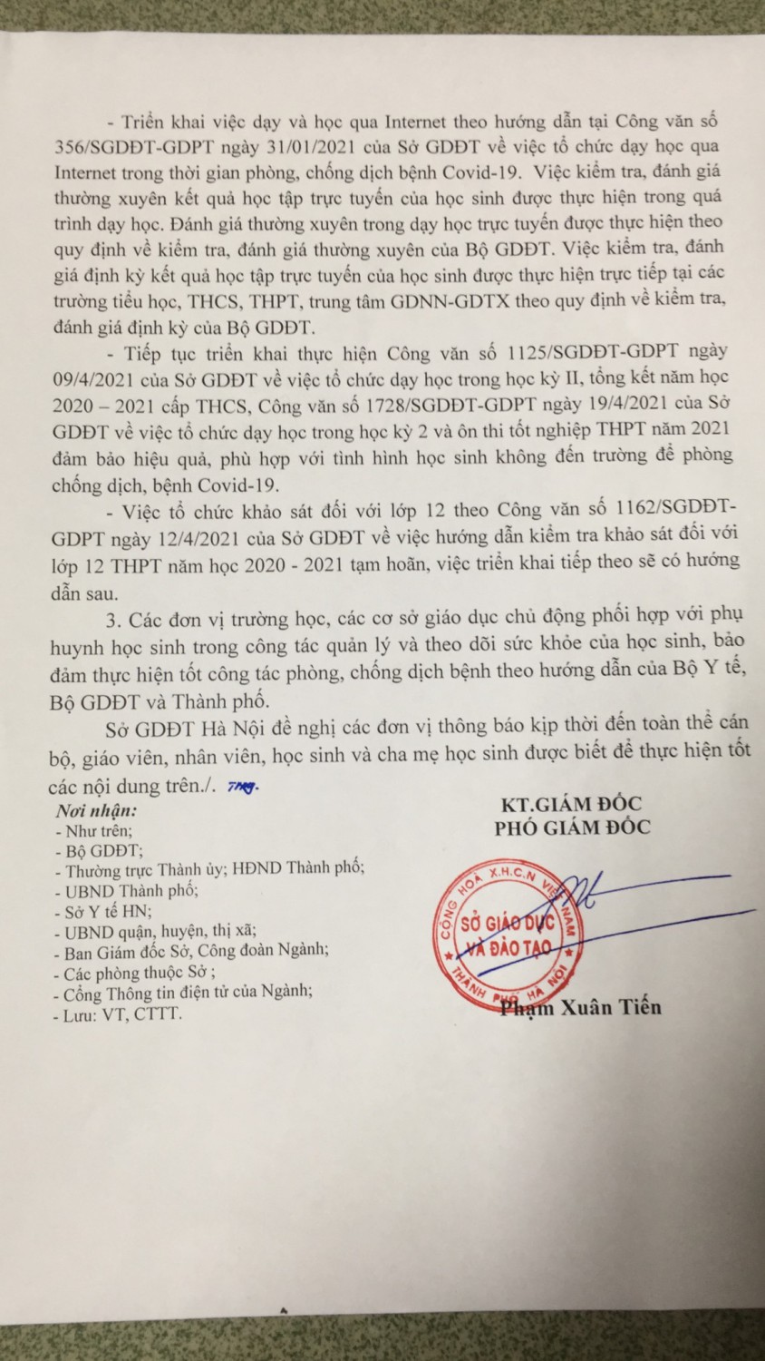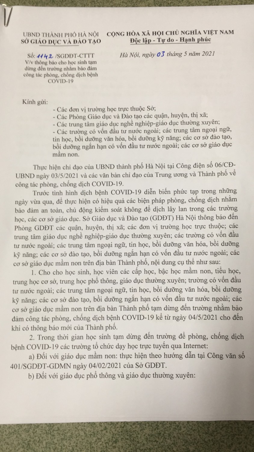 Công văn số 1142/SGDĐT-CTTT ngày 03/05/2021 của Sở giáo dục và đào tạo Hà Nội về việc thông báo cho học sinh tạm dừng đến trường nhằm đảm bảo công tác phòng, chống dịch bệnh Covid-19.