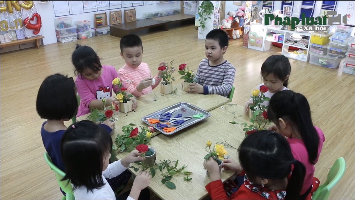Các bạn học sinh lớp A1-trường Mầm non Hàng Đào - quận Hà Đông tự tay cắm những bông hoa tươi thắm tặng cô giáo nhân Ngày Nhà giáo Việt Nam 20-11
