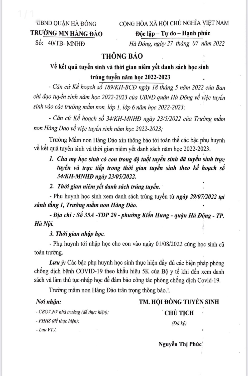 Thông báo kết quả tuyển sinh và thời gian niêm yết danh sách học sinh trúng tuyển năm học 2022-2023