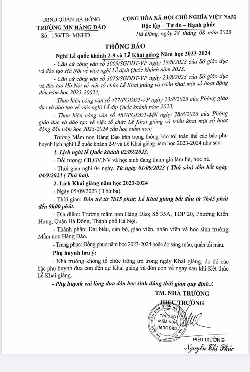 Nghỉ Lễ quốc khánh 2-9 và Lễ Khai giảng Năm học 2023-2024 - Căn cứ công văn số 3009/SGDĐT-VP ngày 18/8/2023 của Sở giáo dục và đào tạo Hà Nội về việc nghỉ Lễ dịch Quốc khánh năm 2023; - Căn cứ công văn số 3075/SGDĐT-VP ngày 23/8/2023 của Sở giáo dục và đào tạo Hà Nội về việc tổ chức Lễ Khai giảng và triển khai một số hoạt động đầu năm học 2023-20024; - Thực hiện công văn số 477/PGDĐT-VP ngày 23/8/2023 của Phòng giáo dục và đào tạo về việc nghỉ Lễ dịp Quốc khánh năm 2023; - Thực hiện công văn số 487/PGDĐT-MN ngày 28/8/2023 của Phòng giáo dục và đào tạo vê việc tổ chức Lễ Khai giảng và triển khai một số hoạt động đầu năm học 2023-2024 cấp học mầm non;