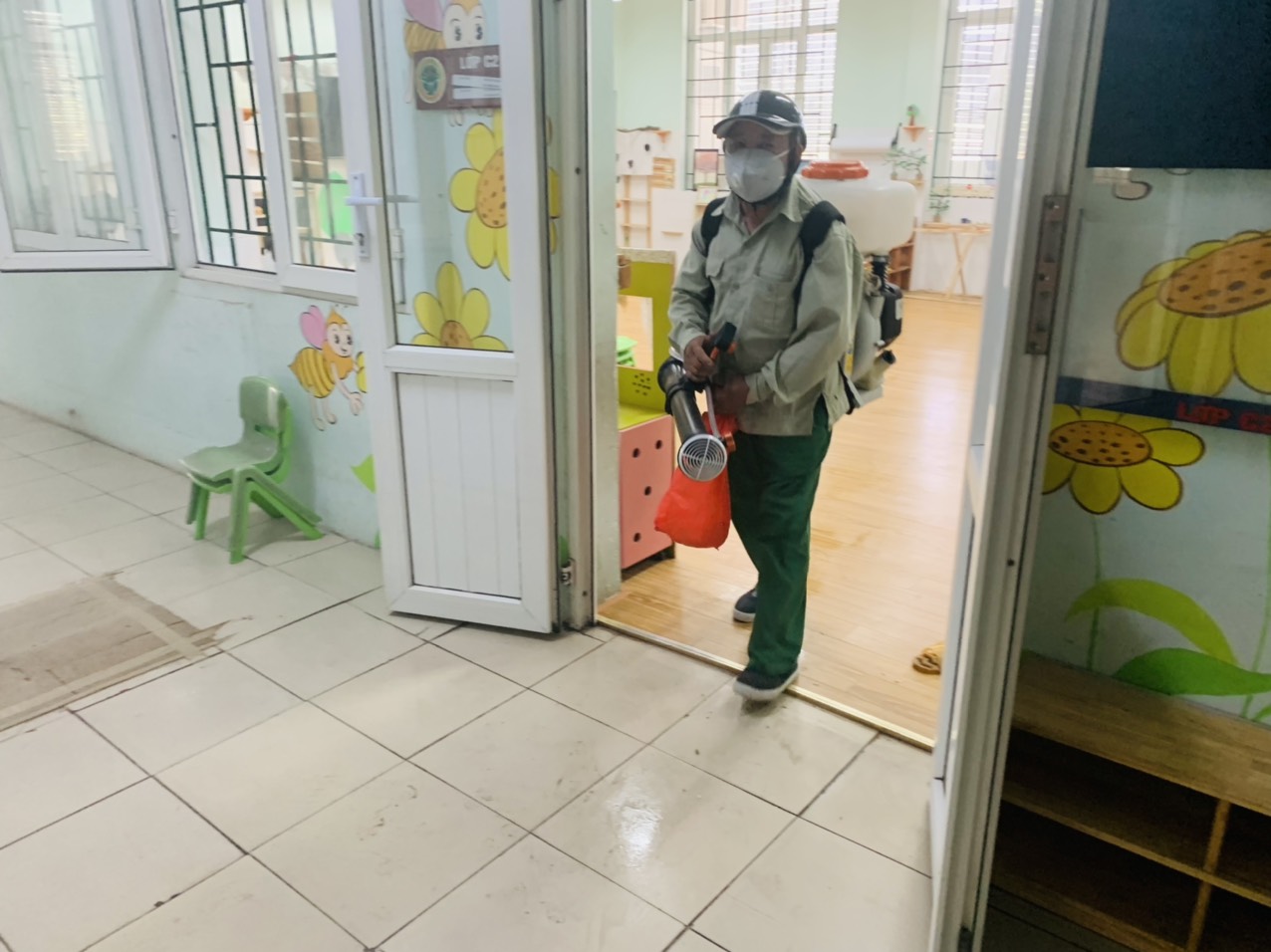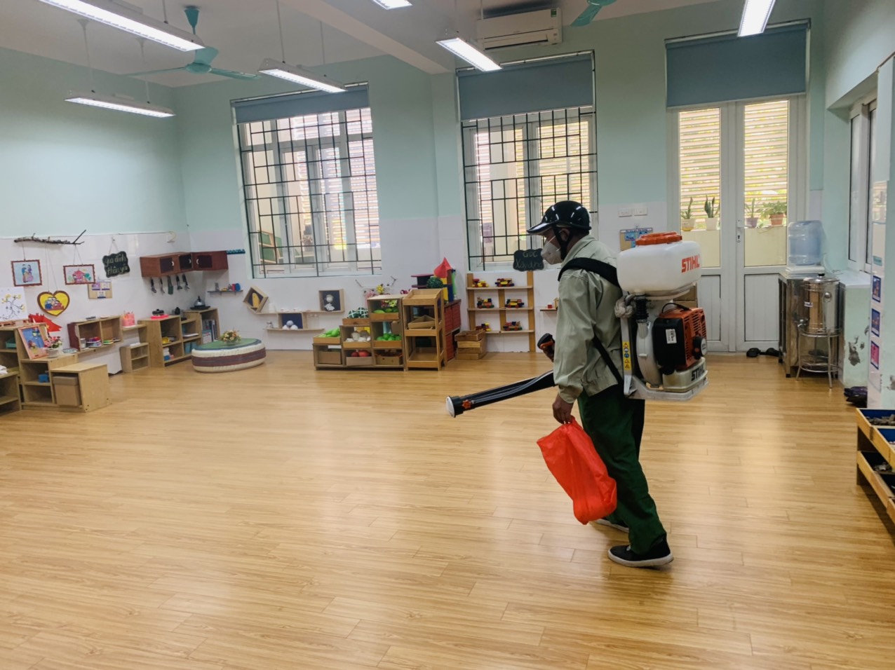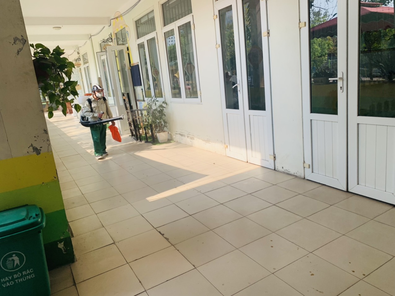 Ban giám hiệu thông báo tới toàn thể CBGVNV, phân công nhiệm vụ, chỉ đạo các lớp học, phòng chức năng để mở các mảng tường, mở các góc chơi, nhà vệ sinh thông thoáng để việc phun hóa chất được thuận lợi. Trong quá trình phun thuốc, đại diện Ban giám hiệu, nhân viên y tế, bảo vệ giám sát việc pha thuốc theo tỷ lệ chuẩn và phun thuốc, đảm bảo 100% lóp học, phòng chức năng, các góc hoạt động của trẻ, khu bếp, các hành lang, cầu thang, các khu vực sân trường đều được phun thuốc đầy đủ.