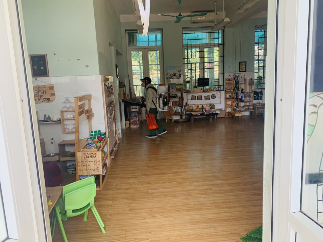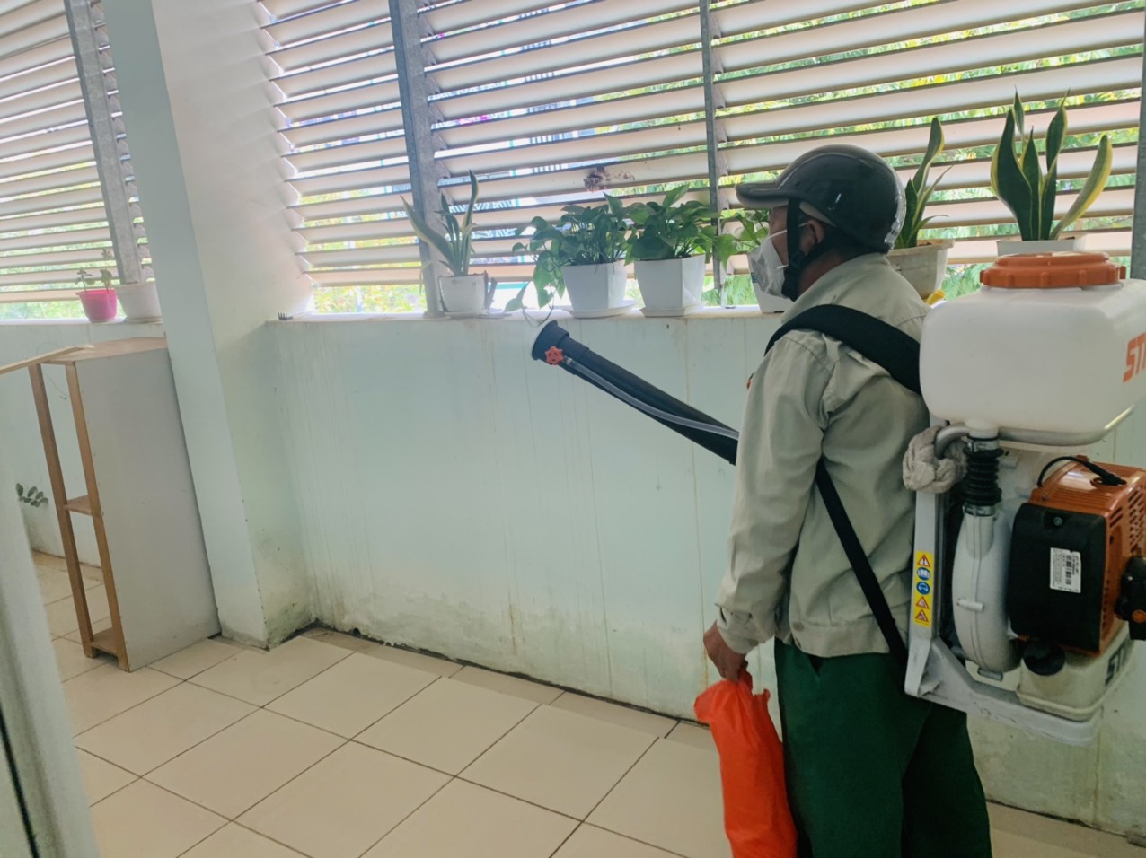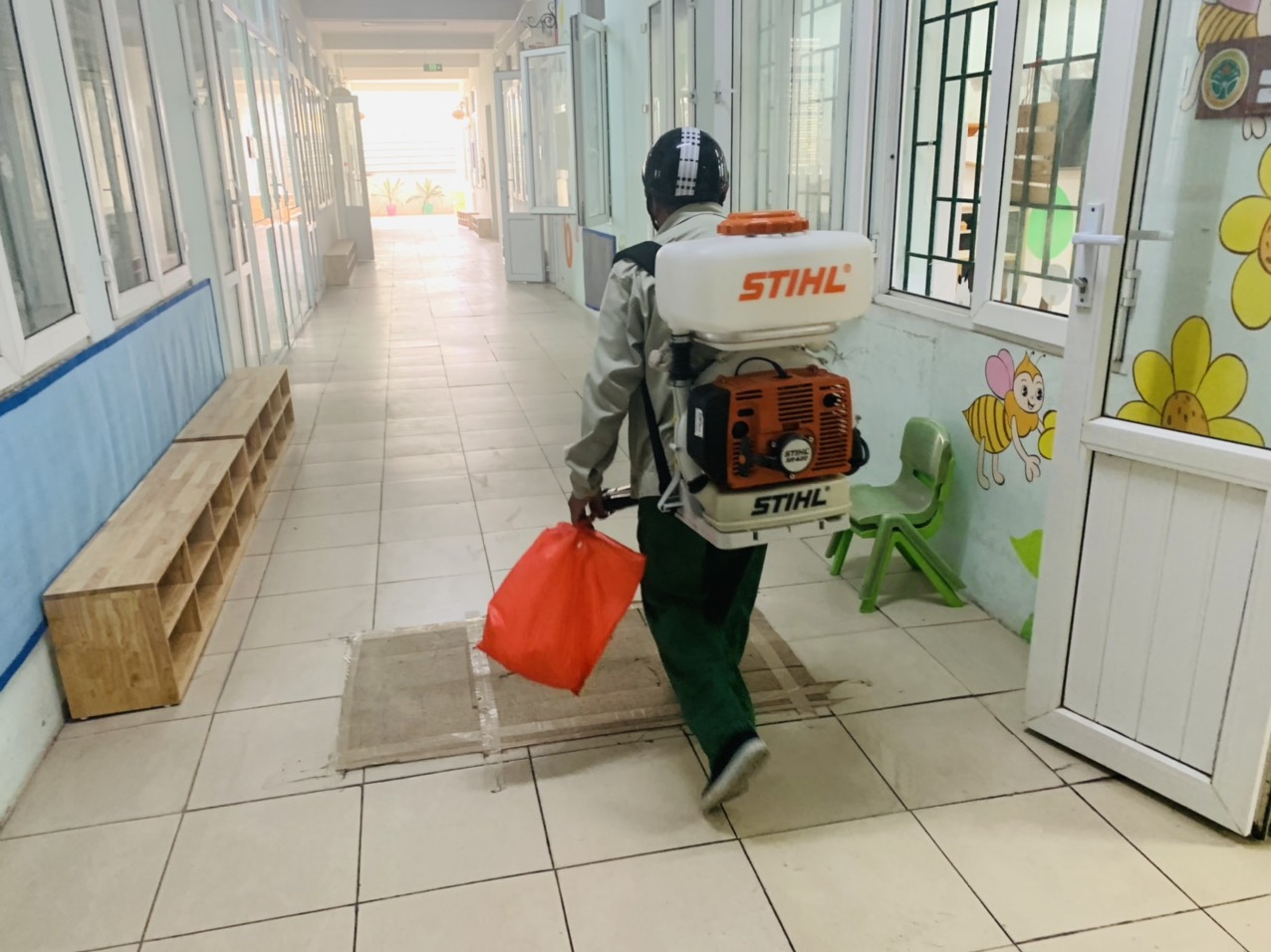 Ban giám hiệu thông báo tới toàn thể CBGVNV, phân công nhiệm vụ, chỉ đạo các lớp học, phòng chức năng để mở các mảng tường, mở các góc chơi, nhà vệ sinh thông thoáng để việc phun hóa chất được thuận lợi. Trong quá trình phun thuốc, đại diện Ban giám hiệu, nhân viên y tế, bảo vệ giám sát việc pha thuốc theo tỷ lệ chuẩn và phun thuốc, đảm bảo 100% lóp học, phòng chức năng, các góc hoạt động của trẻ, khu bếp, các hành lang, cầu thang, các khu vực sân trường đều được phun thuốc đầy đủ.