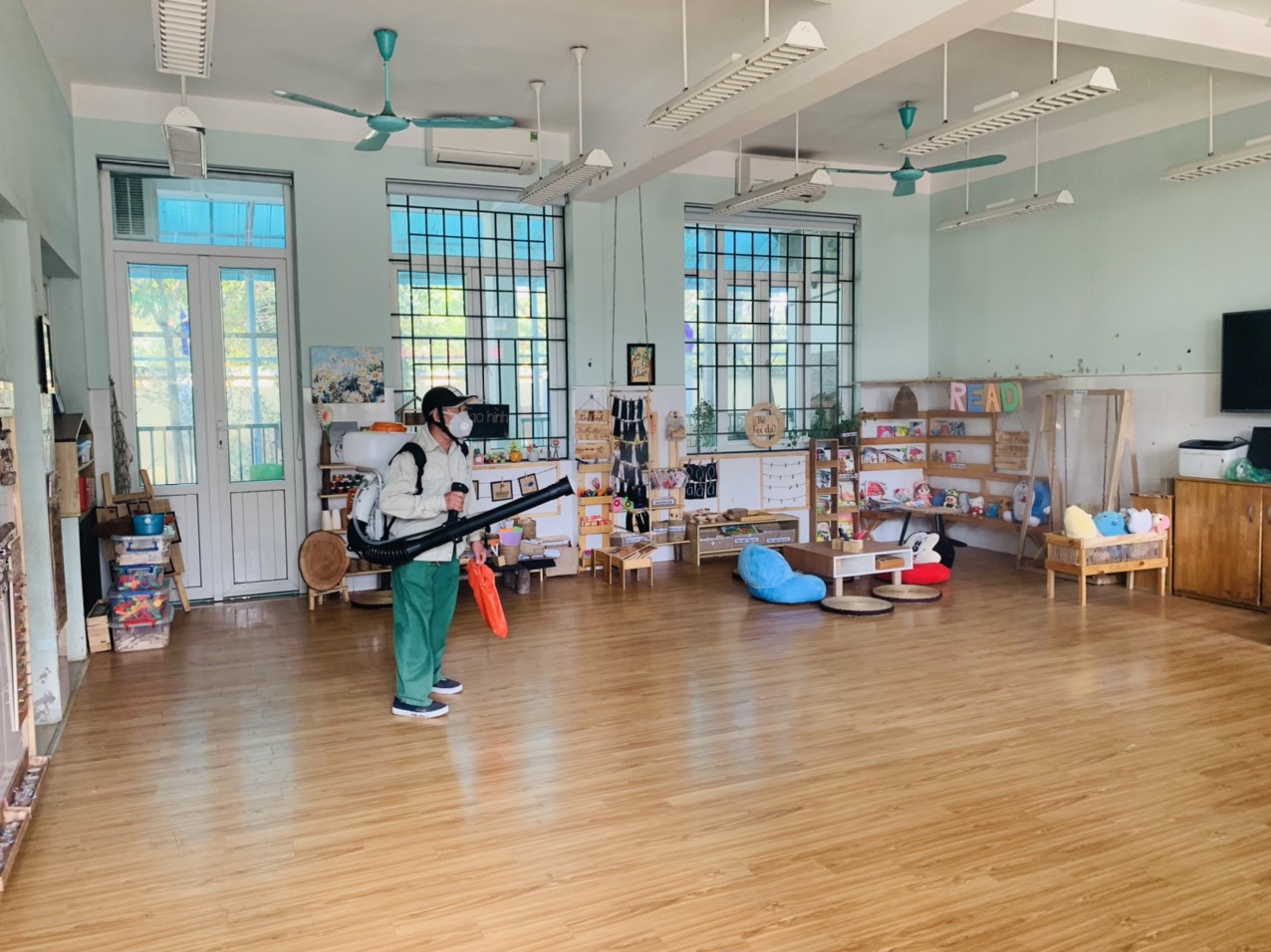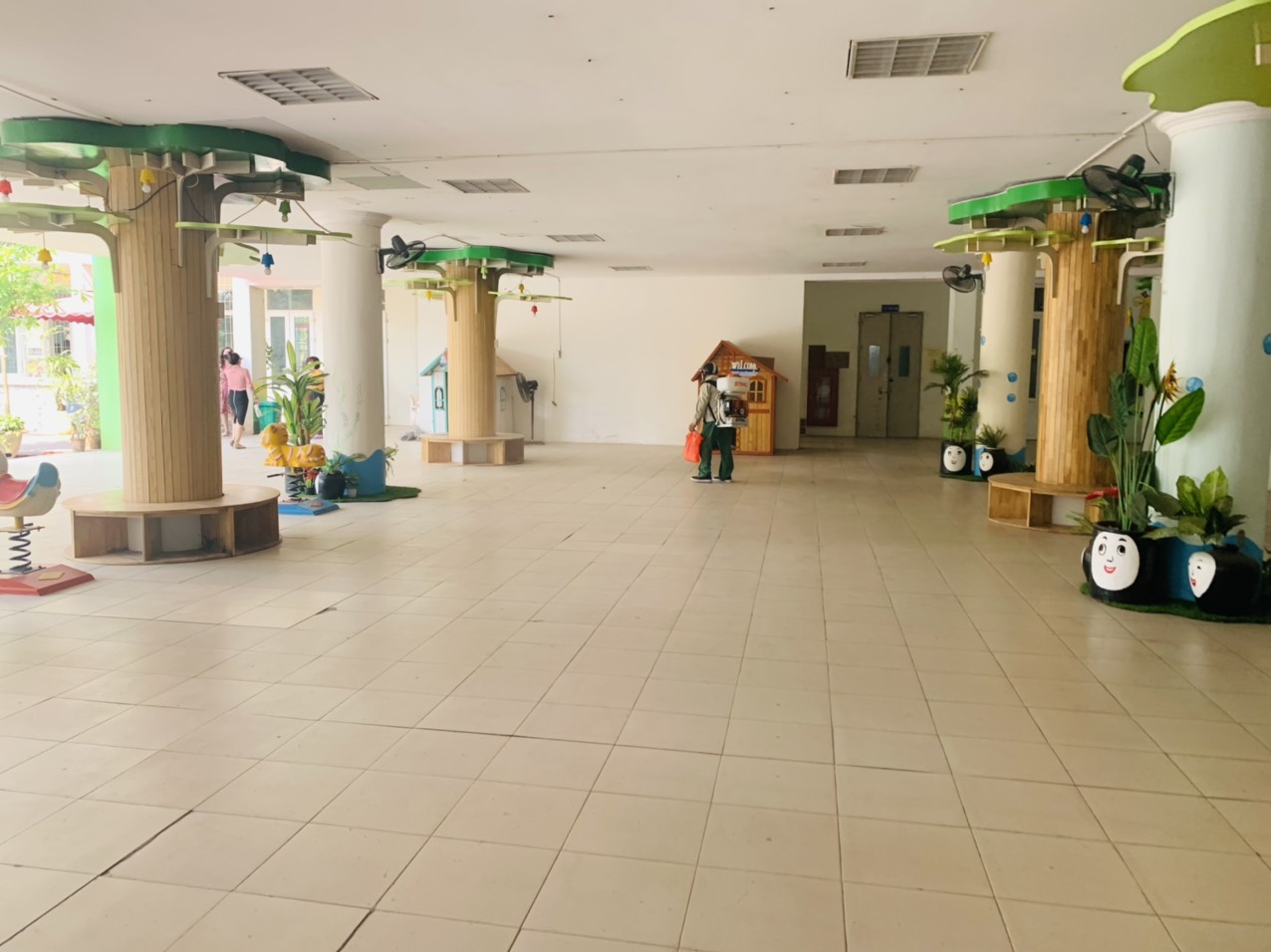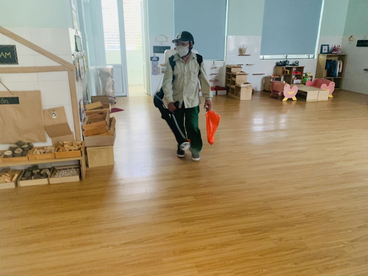 Trước ngày trẻ đến trường, toàn thể CBGVNV sẽ có mặt để tổng vệ sinh toàn bộ môi trường, lau dọn vệ sinh lớp học, phòng chức năng, nhà bếp, các khu vực sân, khu vui chơi để đón các bé đi học, đảm bảo môi trường an toàn, sạch sẽ.